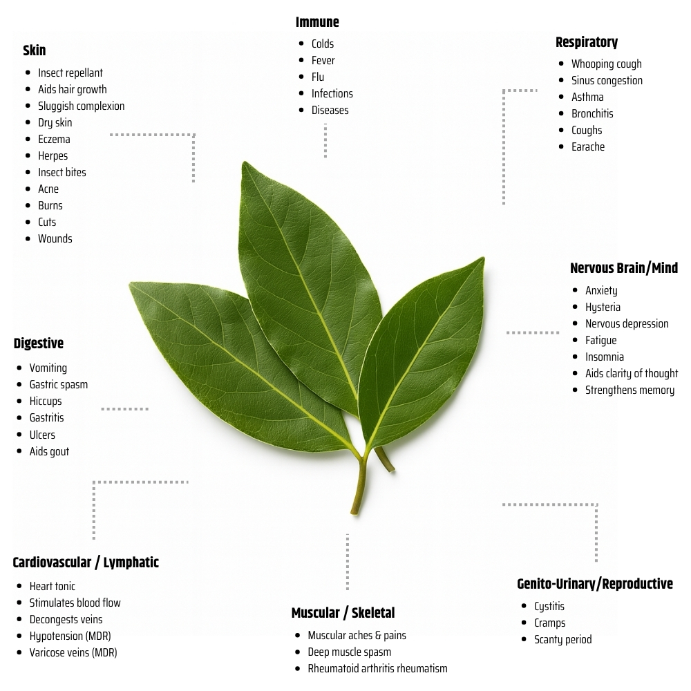 On a physical level, Bay Laurel is used to support healthy lymphatic circulation, ease respiratory congestion, and assist with tension in the body. Dr. Kurt Schnaubelt notes its effectiveness for swollen lymph nodes when applied topically (properly diluted). Whether inhaled or gently massaged into the skin, this versatile oil brings a quiet sense of composure and strength.