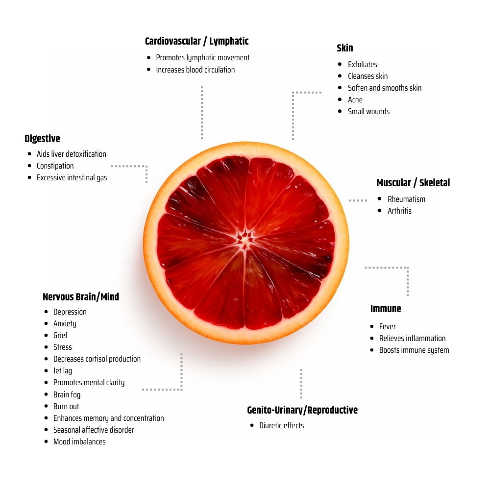 Beloved for its uplifting qualities, Blood Orange helps encourage positivity, reduce stress, and inspire joy. It is also valued in skincare for its clarifying and toning properties, bringing radiance and balance to the complexion. With a reputation as a mild aphrodisiac, it is often included in blends that nurture both the body and emotions.