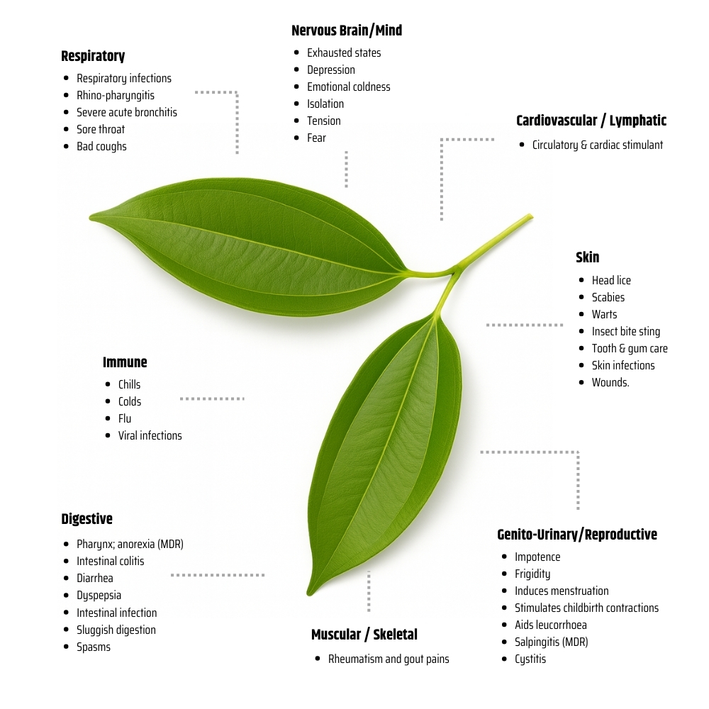Warms and energises without the intensity of bark oil; ideal for cold seasons or emotional fatigue.