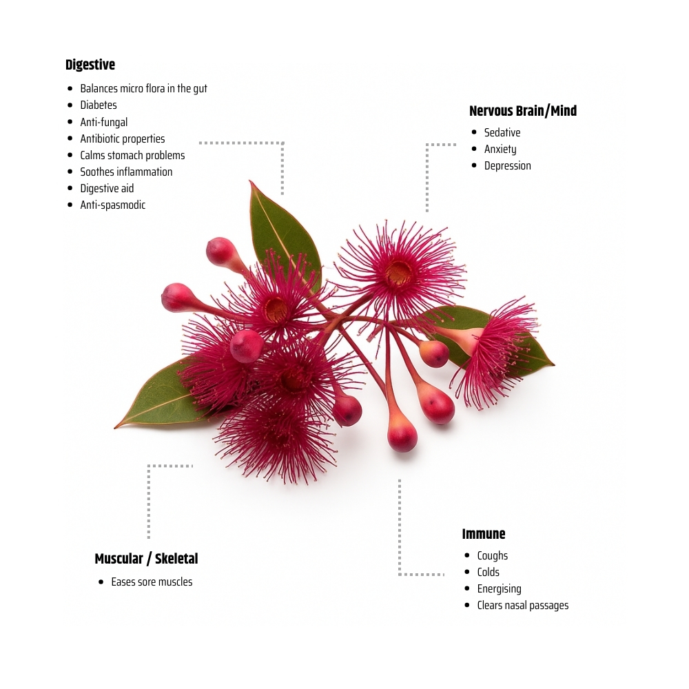 While technically a eucalyptus, its sweet and fruity profile is uplifting, playful, and emotionally brightening, perfect for diffusing during low energy moments or blending with other native oils to create unique, mood boosting aromatherapy formulations.