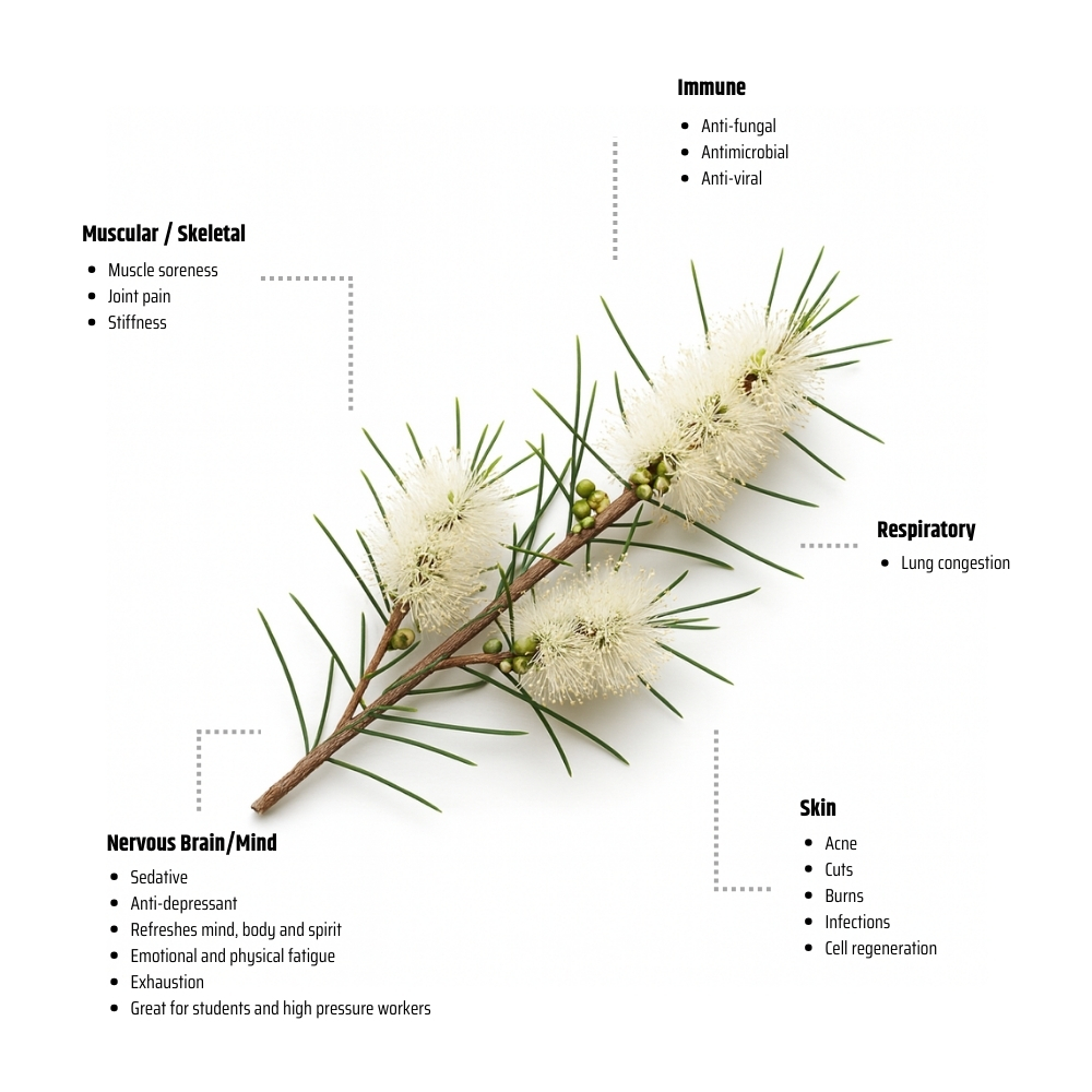 Often described as both calming and invigorating, Honey Myrtle can help clear emotional tension while refreshing the atmosphere around you. Traditionally valued for its protective qualities, it is also a beautiful addition to skincare formulations, helping to clarify congested or blemish prone skin. With its sweet, flamboyant scent and balancing effect on body and mind, Honey Myrtle has become one of Australia’s most cherished aromatics.