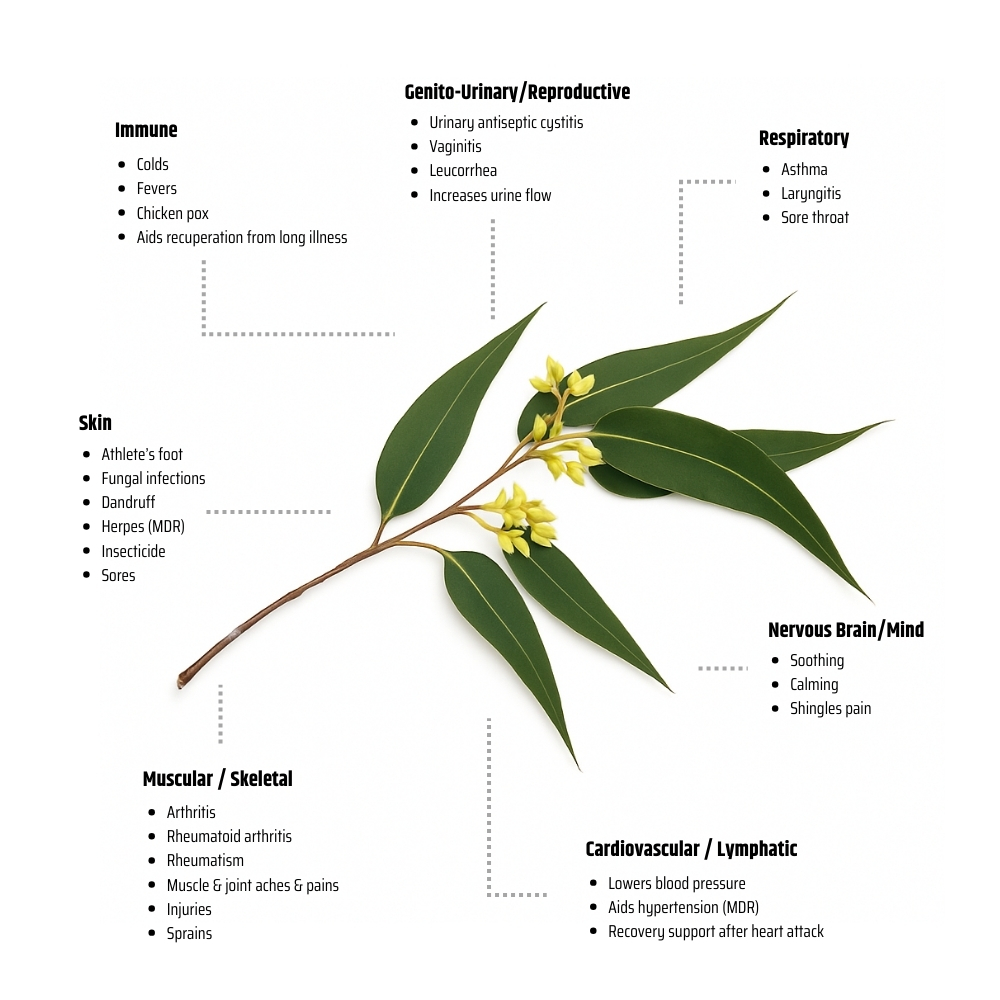 Not to be confused with Eucalyptus staigeriana, Lemon Scented Eucalyptus has a stronger lemon citronella profile with a more direct purifying effect. It blends beautifully with other Australian native oils such as Kunzea, Fragonia, Lemon Myrtle, and Rosalina, as well as with citrus oils for bright, energising synergies.