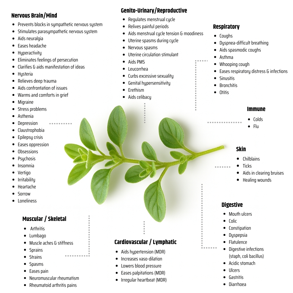 In modern aromatherapy, Sweet Marjoram continues to be a highly versatile oil. It is commonly used to help reduce stress and anxiety, support restful sleep, and relieve muscular discomfort when blended into massage oils. Its gentle aphrodisiac qualities, combined with its calming influence on the nervous system, make it a beautiful oil for creating soothing evening blends or romantic atmospheres.