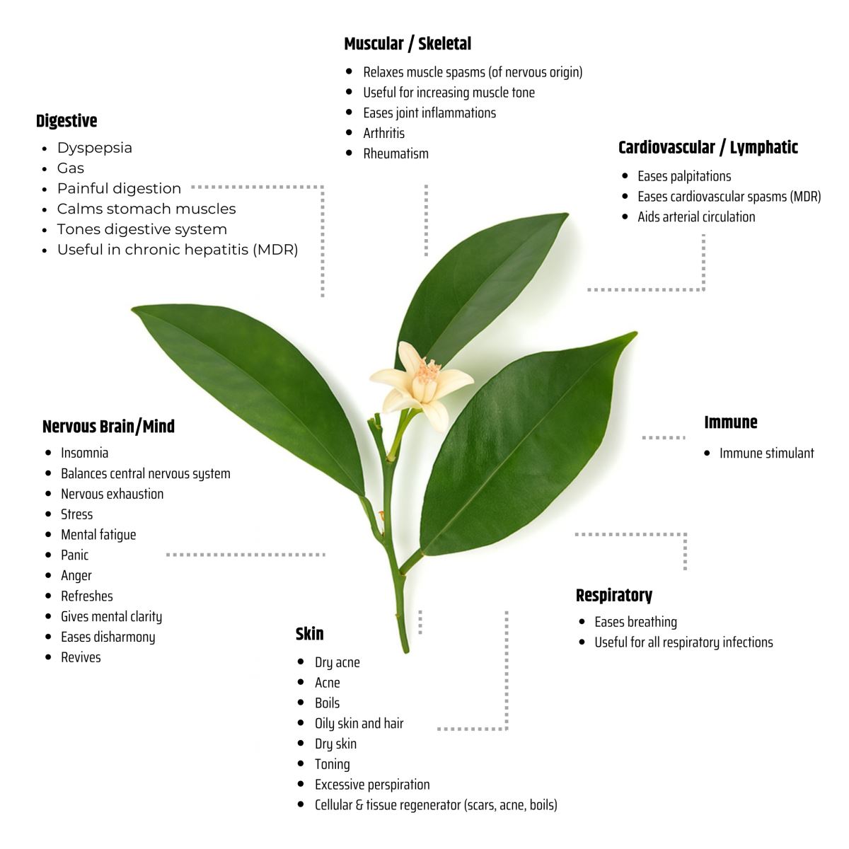 This versatile oil is valued for its ability to calm the mind, ease feelings of tension, and support skin health with its clarifying benefits. Whether diffused to refresh the atmosphere or blended into massage and skincare applications, Petitgrain brings a clean, restorative energy that encourages both emotional balance and physical renewal.