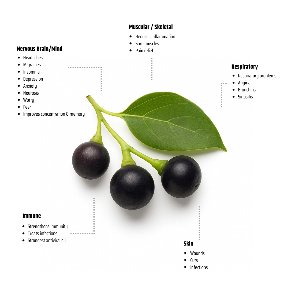 Known as one of the most important oils in modern aromatherapy for winter wellness, Ravintsara is traditionally used to ease coughs, colds, and seasonal fatigue. Its high content of 1,8-cineole (eucalyptol) gives it antiviral, antibacterial, and expectorant actions, making it a natural ally during times of lowered immunity or respiratory discomfort. Beyond its respiratory uses, Ravintsara also encourages emotional steadiness and calm, often used to reduce feelings of overwhelm or exhaustion.