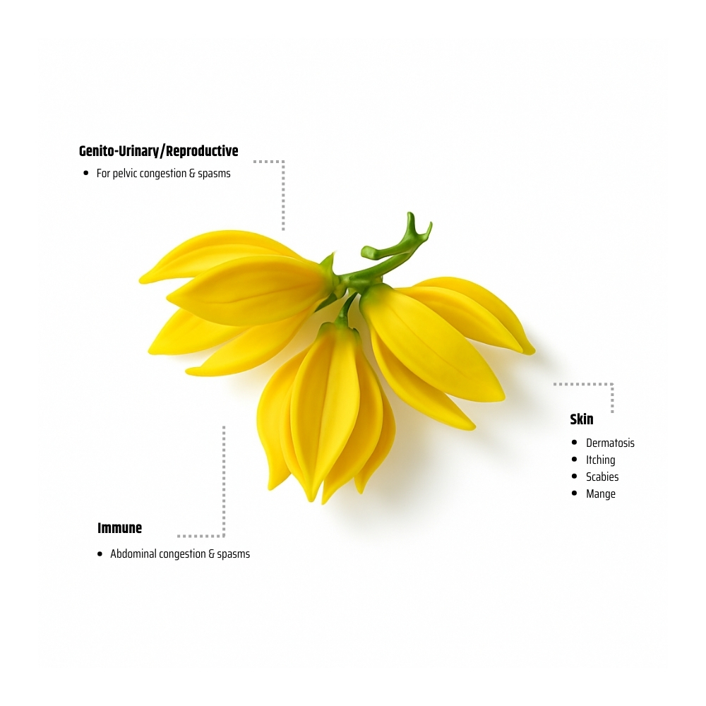 In aromatherapy, Ylang Ylang (Complete) is loved for its ability to induce relaxation, relieve tension, and evoke euphoria. It’s known to help reduce stress, balance mood swings, and enhance sensuality, making it a key ingredient in romantic blends and natural perfumes. On the skin, its balancing and nourishing effects support a radiant complexion and healthy scalp.