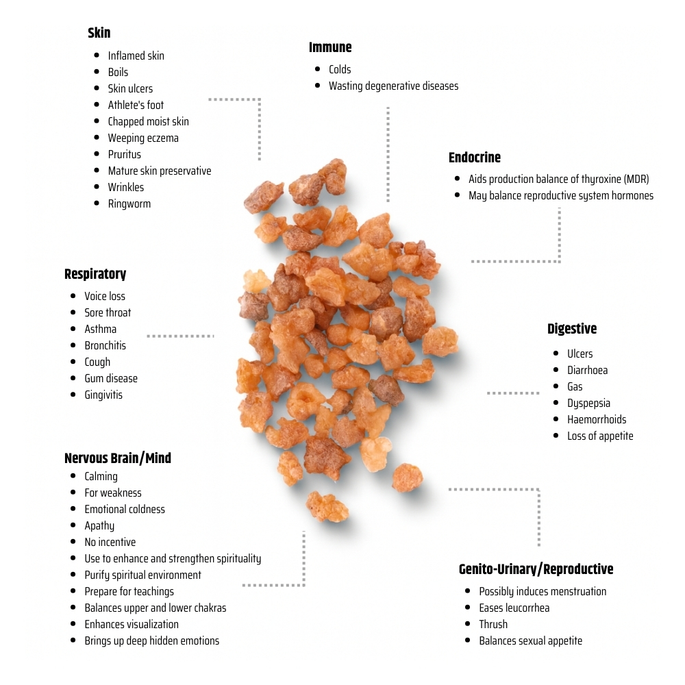 Myrrh’s warm, earthy scent is renowned for calming the mind, deepening meditation, and promoting emotional balance. Its therapeutic properties also extend to skincare and oral health, where it’s prized for its rejuvenating, antimicrobial, and anti inflammatory benefits. A revered ally in spiritual rituals and natural healing, Myrrh continues to be treasured for its ability to connect body, mind, and spirit.