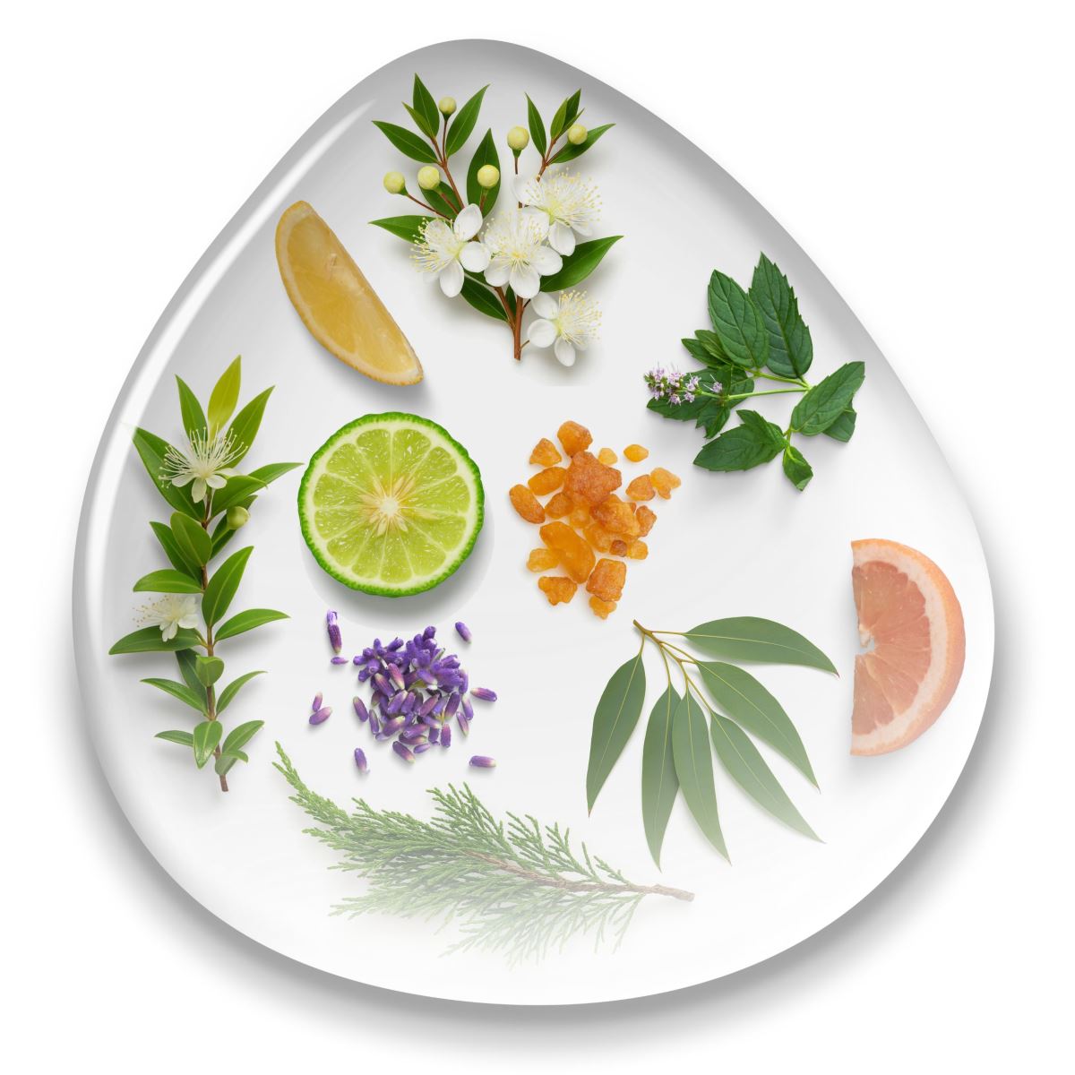 Grapefruit Cold Pressed (Citrus paradisi), Bergamot Bergaptene Free (Citrus aurantium bergamia), Cypress Austrian (Cupressus sempervirens), Myrtle (Myrtus communis), Lemon Myrtle (Backhousia citriodora), Peppermint Australian (Mentha piperita), Frankincense / Olibanum (Boswellia carterii), Lavender Provence (Lavandula angustifolia), Lemon Australian (Citrus limonum), Eucalyptus Radiata (Eucalyptus radiata).