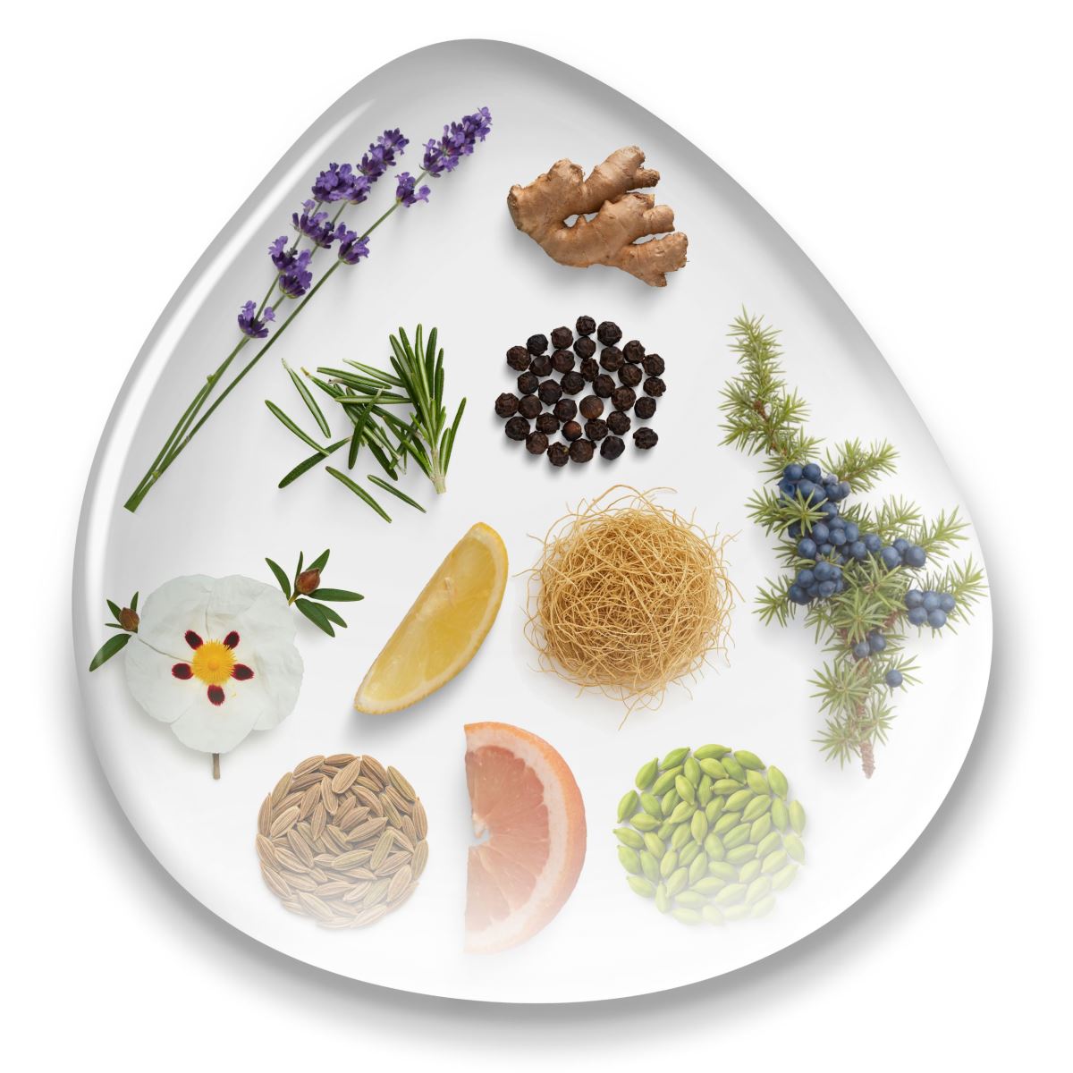 Cistus / Rock Rose (Cistus ladanifer), Carrot Seed (Daucus carota), Black Pepper (Piper nigrum), Juniper (Juniperus communis), Vetivert (Vetiveria zizanoides), Lavender Provence (Lavandula angustifolia), Rosemary 1,8 - Cineole (Rosmarinus officinalis cineole), Grapefruit White (Citrus paradisi), Cardamom (Elettaria cardamomum), Ginger CO₂ (Zingiber officinale), Lemon Australian (Citrus limonum).