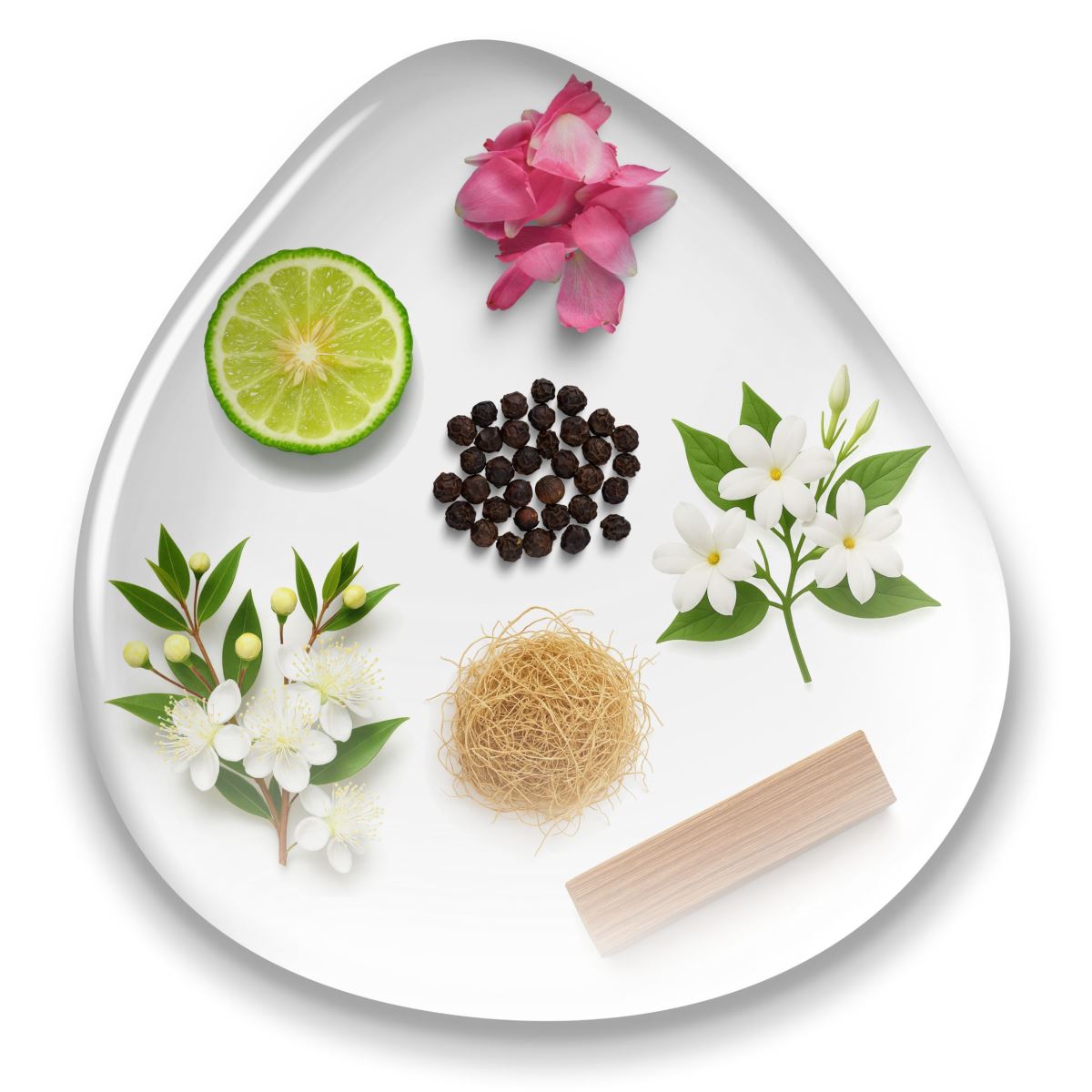 Rose Damascena Otto (Rosa damascena), Jasmin Absolute (Jasminum officinale), Black Pepper (Piper nigrum), Sandalwood WA (Santalum spicatum), Myrtle (Myrtus communis), Vetivert (Vetiveria zizanoides), Bergamot Italian (Citrus bergamia).