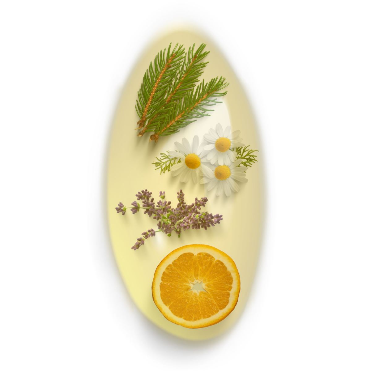 Jojoba (Simmondsia chinensis), Chamomile, Roman (Anthemis nobilis), Cedarwood Atlas (Cedrus atlantica), Sweet Orange (Citrus sinensis), Lavender Provence (Lavandula angustifolia).