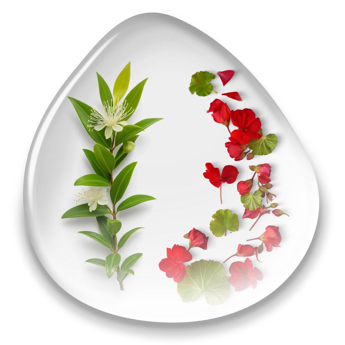 Lemon Myrtle (Backhousia citriodora), Geranium (Pelargonium graveolens).