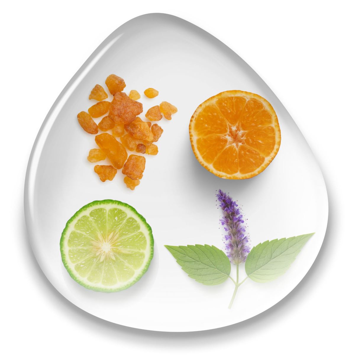 Mandarin (Citrus reticulata), Patchouli (Pogostemon cablin), Frankincense (Boswellia carterii), Bergamot (Citrus aurantium bergamia).