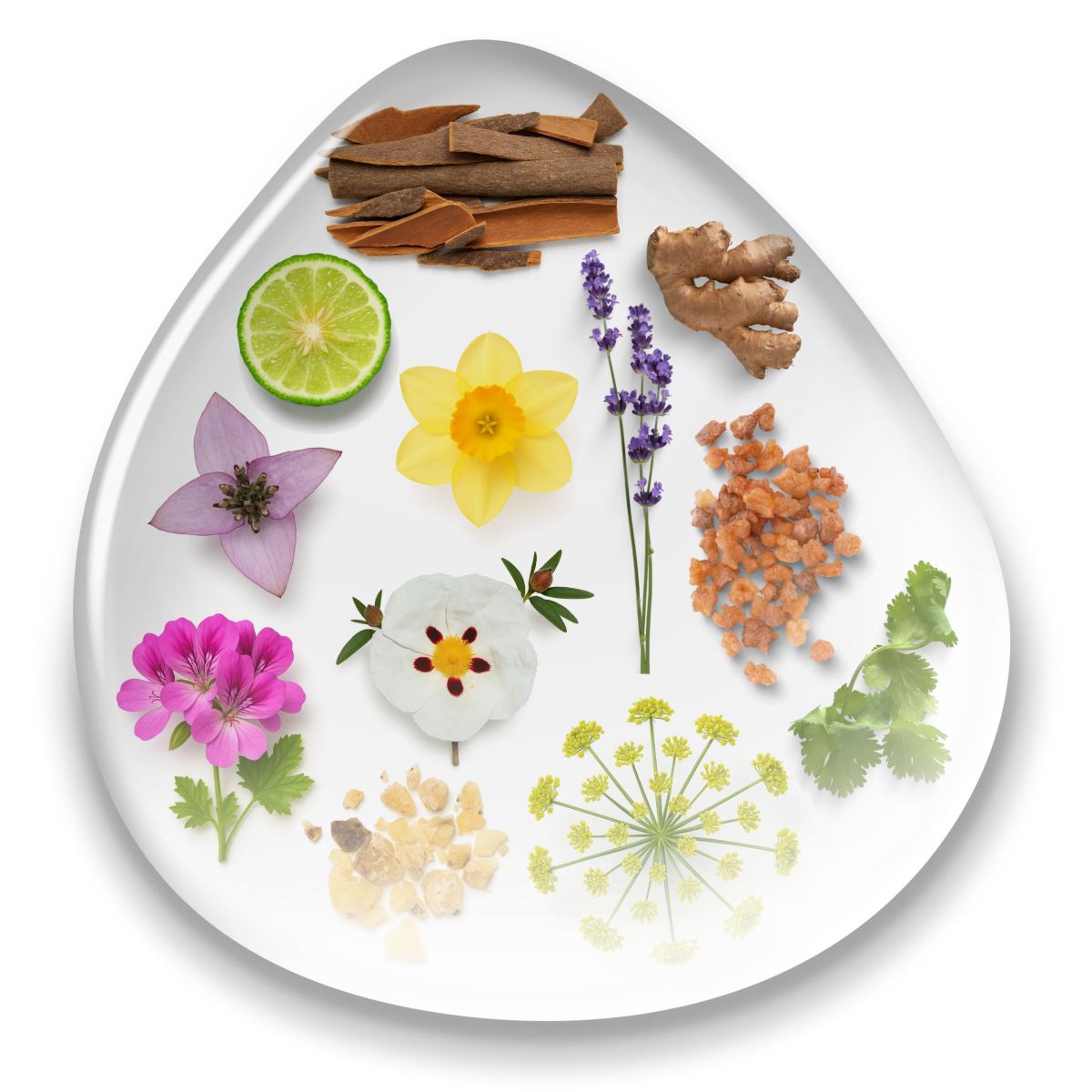 Jonquil (Narcissus jonquilla), Rose Geranium (Pelargonium graveolens), Myrrh (Commiphora myrrha), Cistus / Rock Rose (Cistus ladaniferus), Clary Sage, French (Salvia sclarea), Lavender Provence (Lavandula angustifolia), Galbanum (Ferula galbaniflua), Ho Wood (Cinnamomun camphora), Coriander (Coriandrum sativum), Elemi (Canarium luzonicum), Ginger CO₂ (Zingiber officinale), Bergamot, Italian (Citrus aurantium var. bergamia)