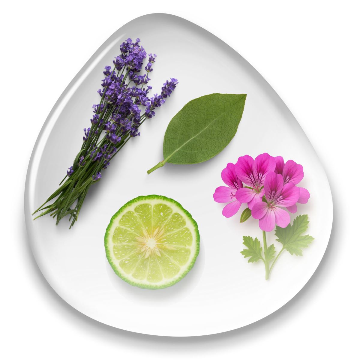 Bay (Laurus nobilis), Lavender Provence (Lavandula angustifolia), Rose Geranium (Pelargonium graveolens), Bergamot, Italian (Citrus aurantium var. bergamia)