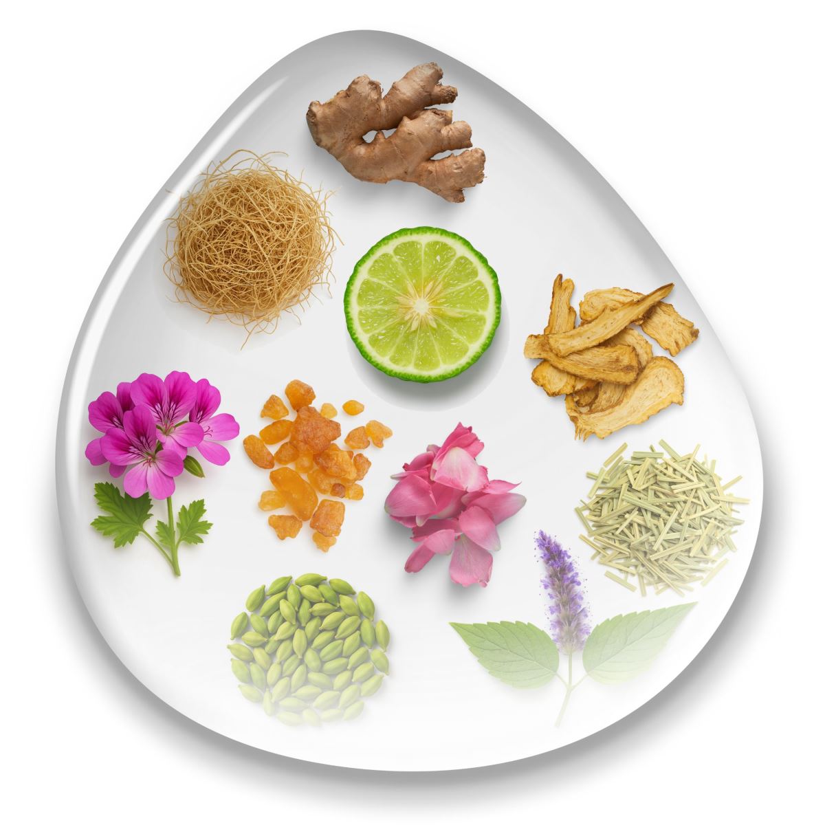 Hay Absolute (Hierochloe odorata), Bergamot, Italian (Citrus aurantium var. bergamia), Frankincense / Olibanum (Boswellia carterii), Vetivert (Vetiveria zizanoides), Angelica Root (Angelica archangelica), Cardamom (Elettaria cardamomum), Ginger CO₂ (Zingiber officinale), Patchouli (Pogostemon cablin), Rose Damascena Otto (Rosa damascena), Rose Geranium (Pelargonium graveolens)