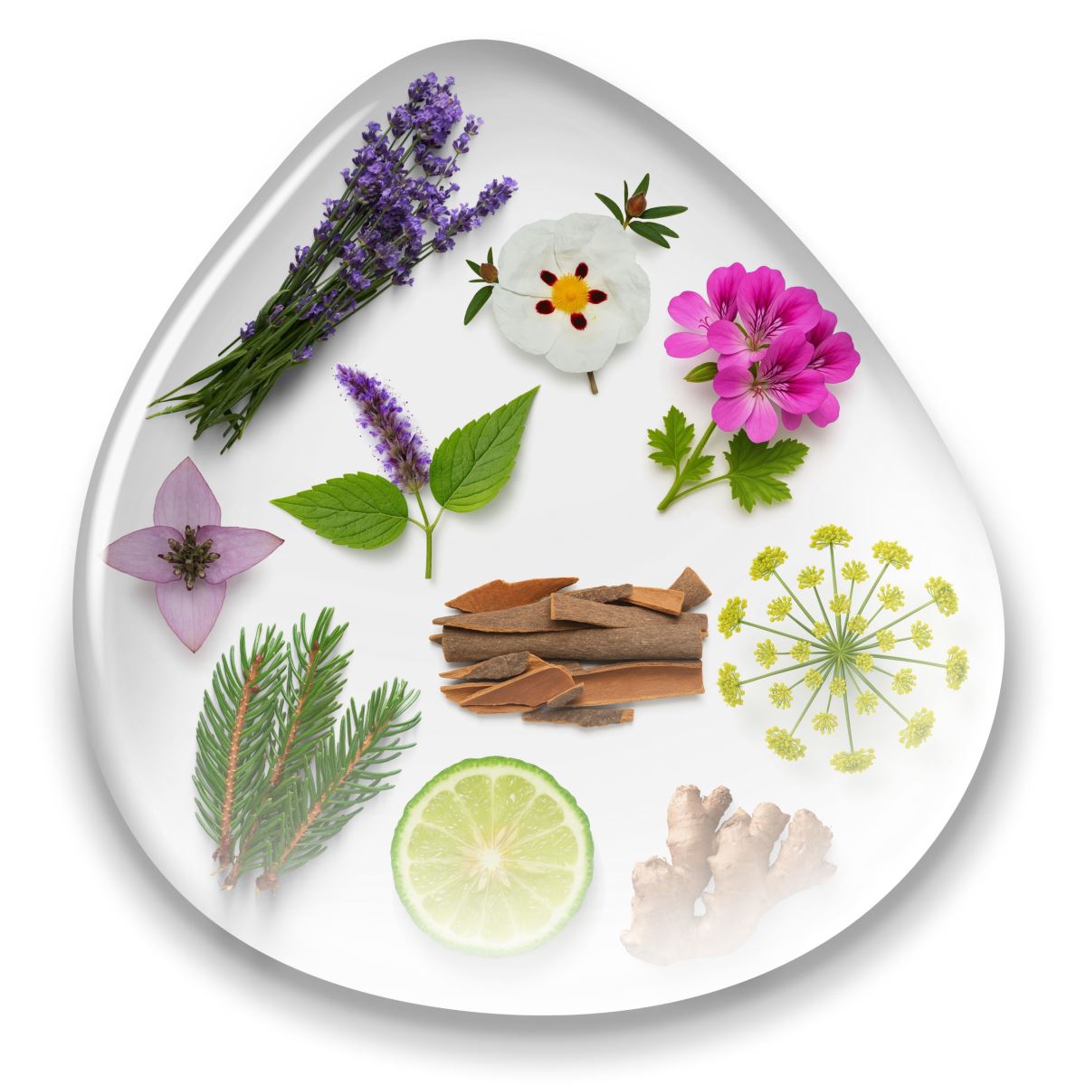 Cistus / Rock Rose (Cistus ladanifer), Clary Sage, French (Salvia sclarea), Galbanum (Ferula galbaniflua), Rose Geranium (Pelargonium graveolens), Bergamot, Italian (Citrus aurantium var. bergamia), Ginger CO₂ (Zingiber officinale), Ho Wood (Cinnamomun camphora), Patchouli (Pogostemon cablin), Lavender Provence (Lavandula angustifolia), Cedarwood Atlas (Cedrus atlantica)