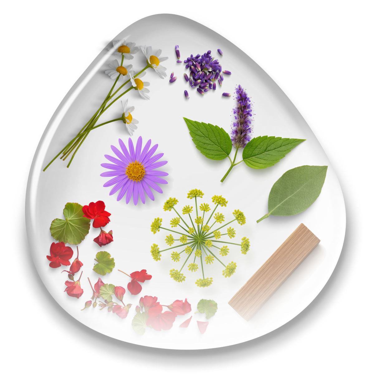 Chamomile, Roman (Anthemis nobilis), Chamomile, German U.K. Extra Blue (Matricaria chamomilla), Bay (Laurus nobilis), Galbanum (Ferula galbaniflua), Sandalwood, WA (Santalum spicatum), Patchouli (Pogostemon cablin), Lavender Provence (Lavandula angustifolia), Geranium Egypt (Pelargonium graveolens)