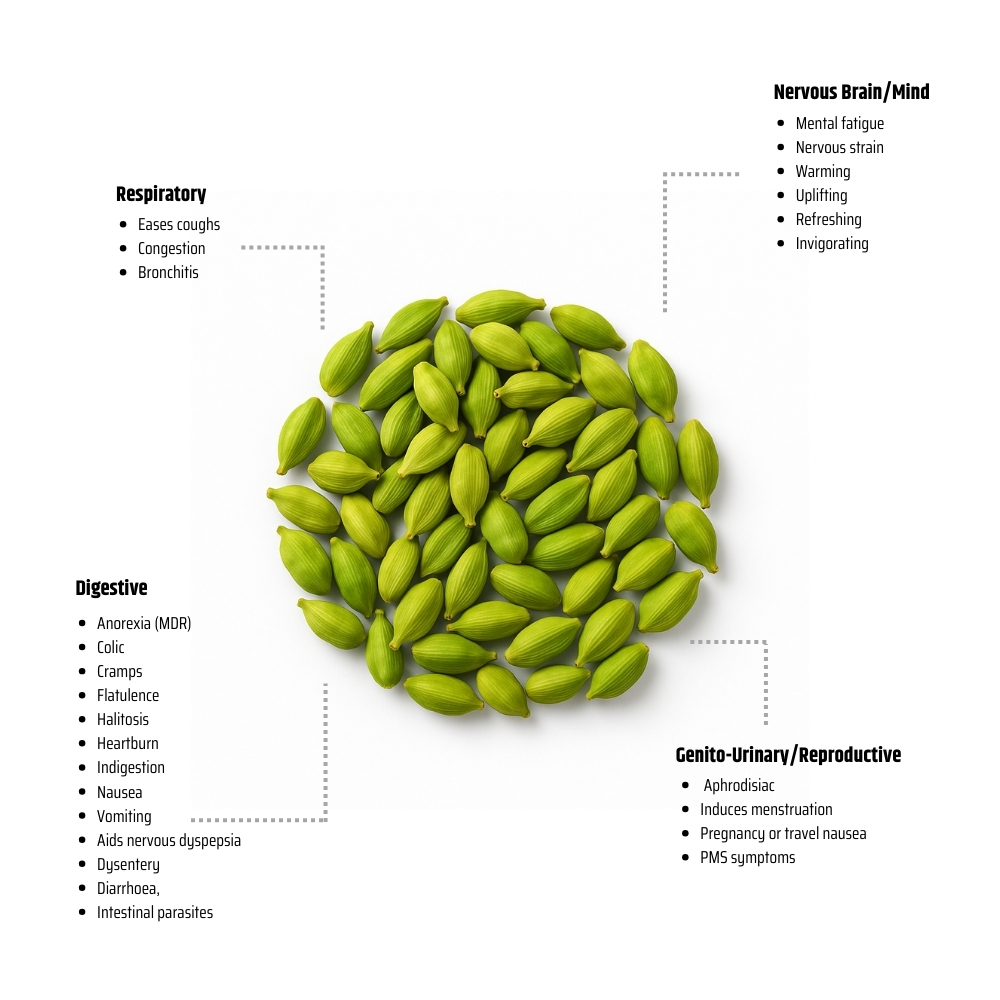 Emotionally, Cardamom is a gently uplifting oil, often used in blends to reduce fatigue, enhance motivation, and provide comfort during stressful times. Physically, it is valued for its calming effect on digestion and ability to soothe tension through the body. Its energising yet grounding nature makes it a perfect partner for citrus oils, woods, and warming spices, ideal in both aromatherapy and natural perfumery.