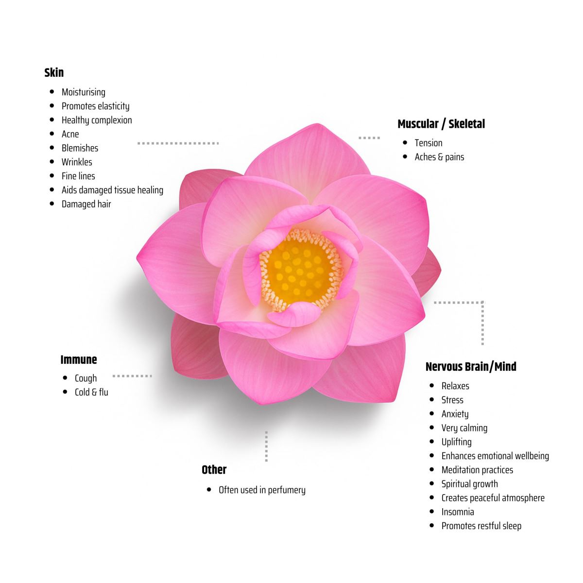 Used traditionally in temples and sacred ceremonies, Pink Lotus is valued for its ability to calm emotional turbulence, soothe anxiety, and open the heart to peace. Its aroma helps restore harmony between body and mind, offering an elegant stillness that encourages inner awareness and compassion. In aromatherapy, it’s often included in blends designed to deepen meditation, relieve tension, and promote spiritual renewal.