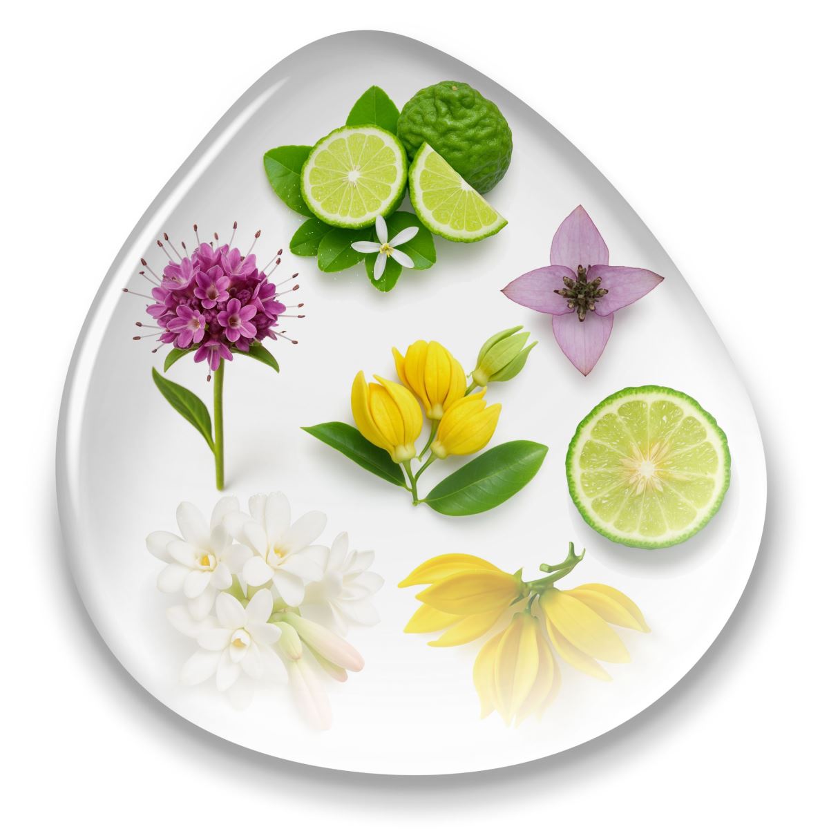 Ylang Ylang Bourbon Extra (Cananga odorata), Clary Sage (Salvia sclarea), Bergamot Bergaptene Free (Citrus aurantium bergamia), Bergamot Petitgrain (Citrus aurantium ssp.), Spikenard (Nardostachys jatamansi), Tuberose (Polianthes tuberosa), Ylang Ylang Complete (Cananga odorata).