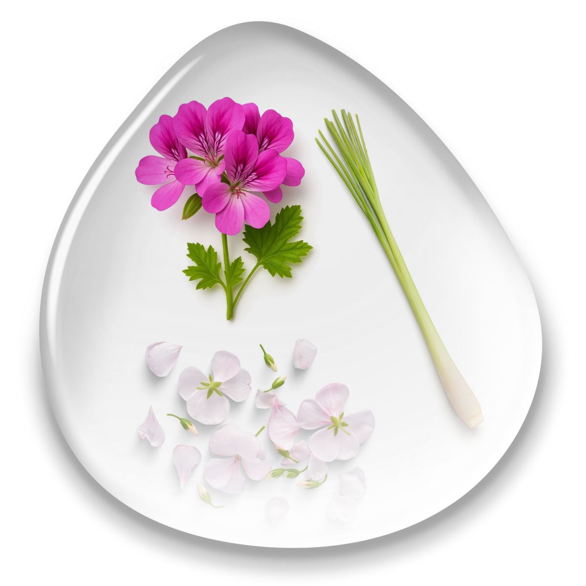 Lemongrass (Cymbopogon citratus), Geranium (Pelargonium graveolens), Rose Geranium (Pelargonium graveolens var. roseum).