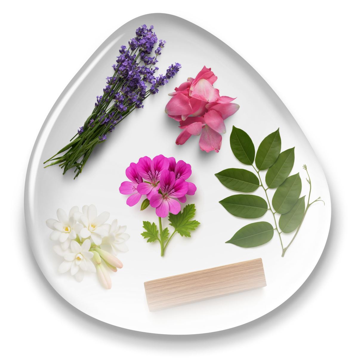 Tuberose (Polianthes tuberosa), Rose Damascena Otto (Rosa damascena), Lavender Provence (Lavandula angustifolia), Peru Balsam (Myroxylon balsamum), Sandalwood, WA (Santalum spicatum), Rose Geranium (Pelargonium graveolens)