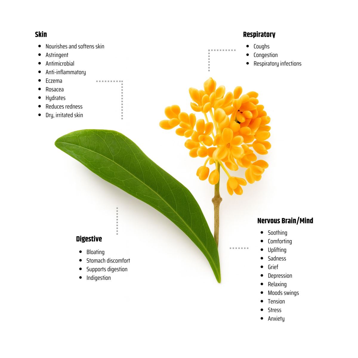 In aromatherapy, Osmanthus Absolute is known for its emotionally balancing and heart lifting qualities. Its tranquil scent can ease stress, promote mindfulness, and instill a sense of gentle optimism, making it ideal for meditation or evening relaxation. Spiritually, it is associated with harmony and inner peace, encouraging stillness and self compassion.